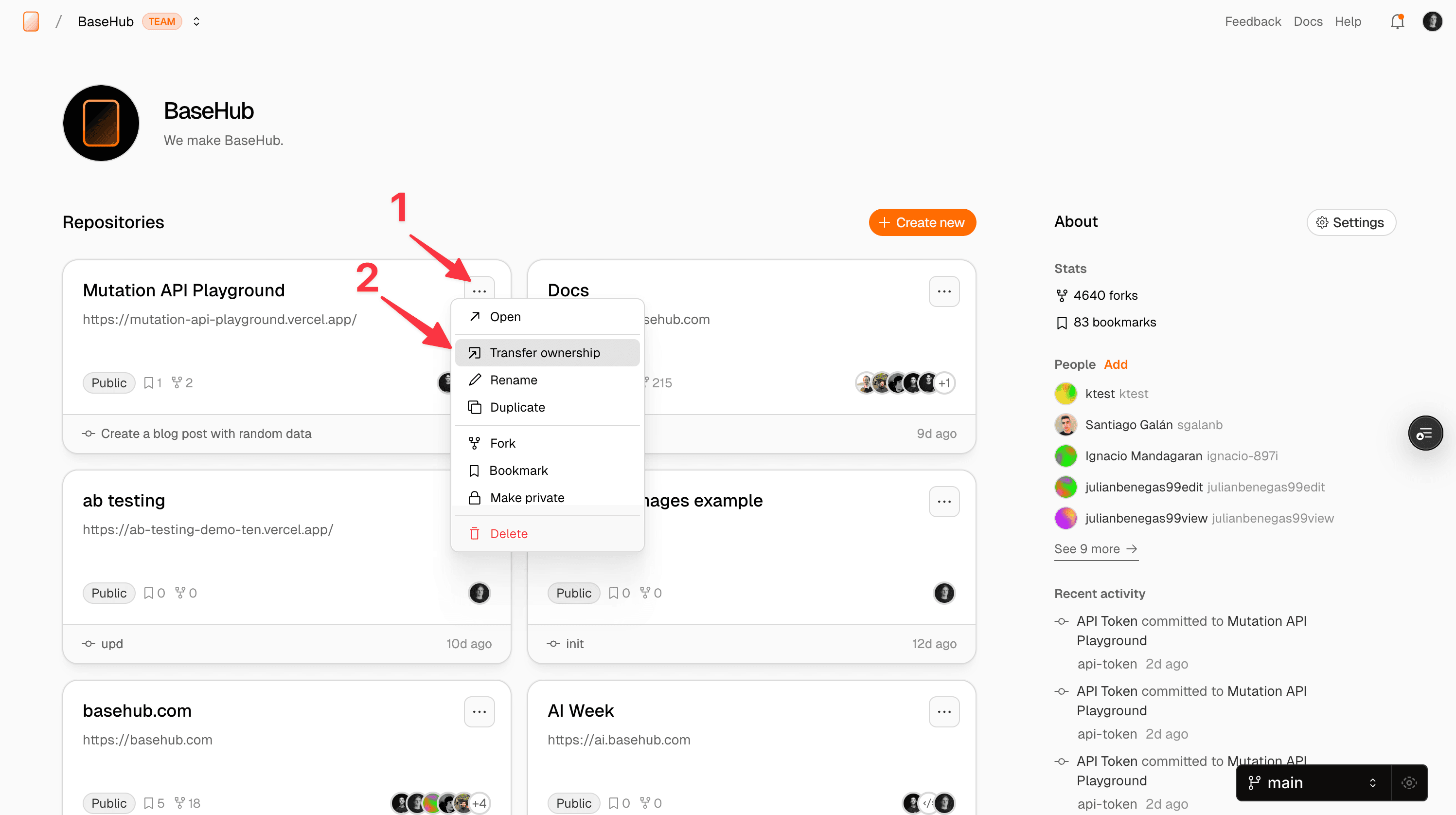 Learn how to easily transfer ownership of a repository to another team within your BaseHub dashboard, ensuring you have the necessary permissions to complete the process.